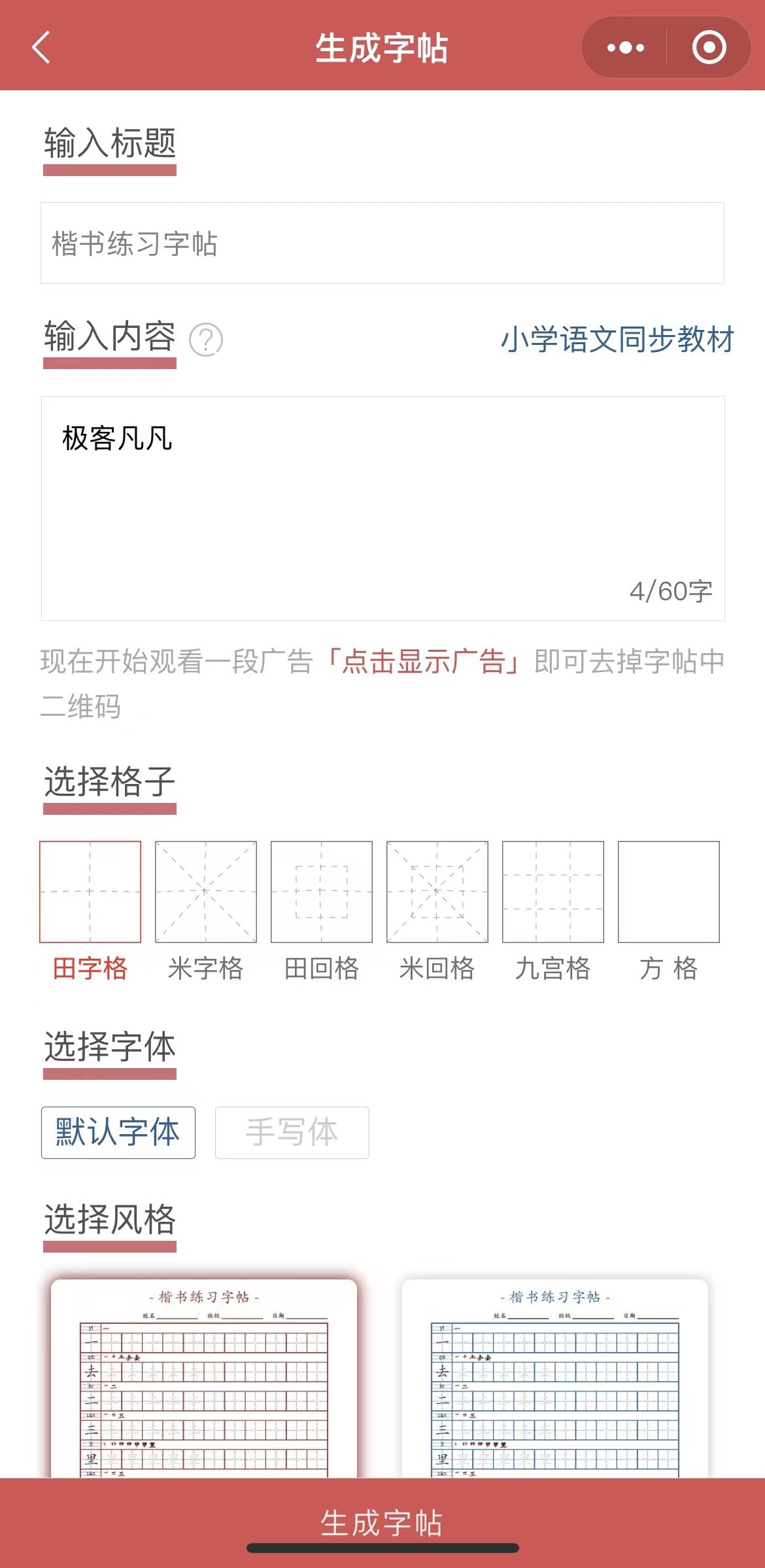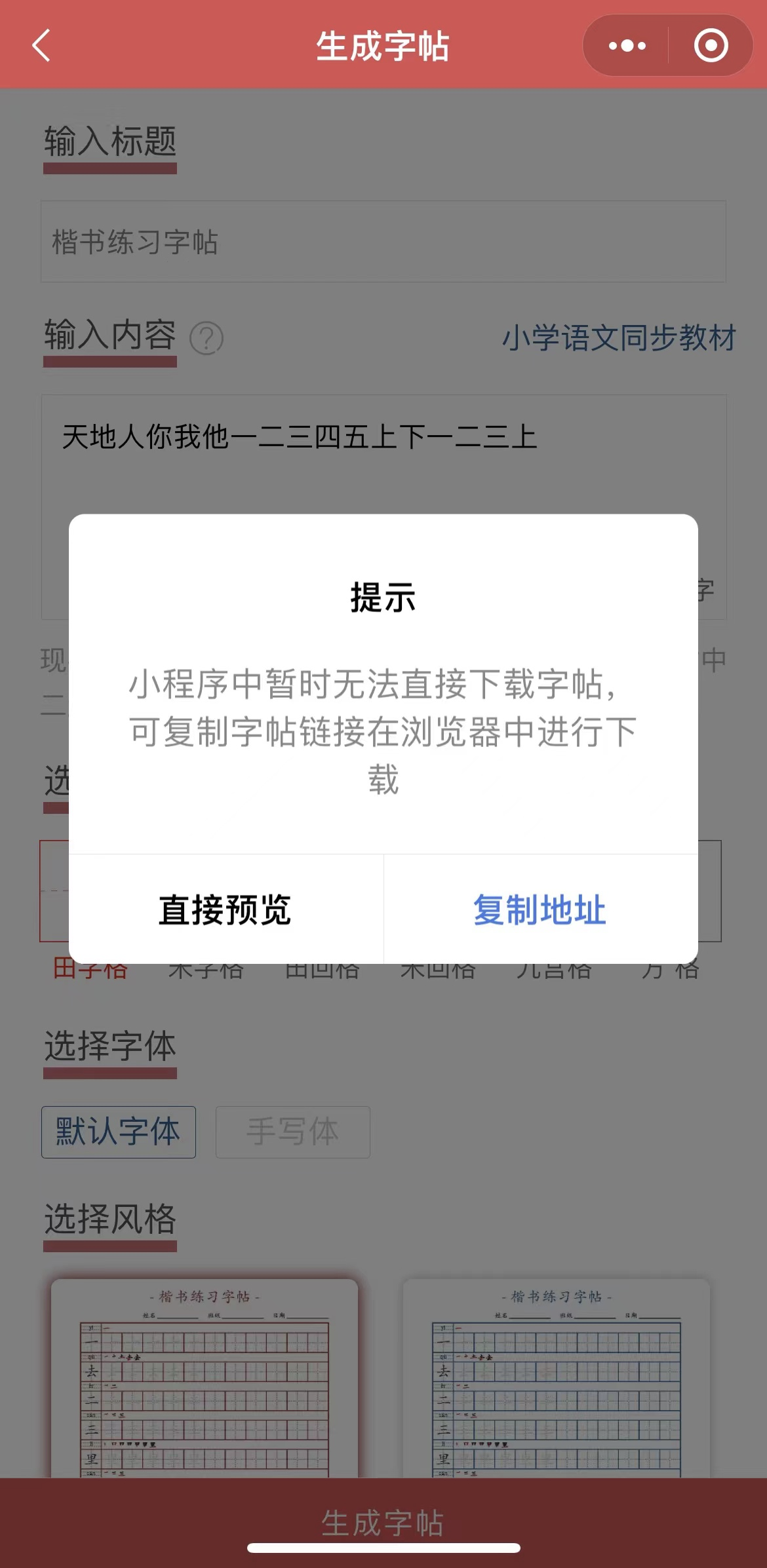 点击喜欢的模版会进入字帖的生成页面(如下)