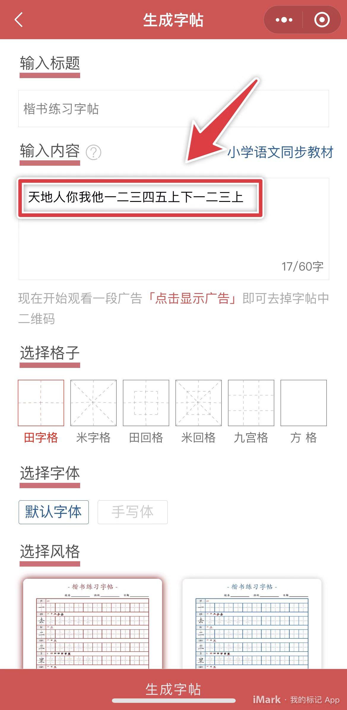第1步:选择模版-》第2步:输入字帖内容-》第3步:点击生成即可