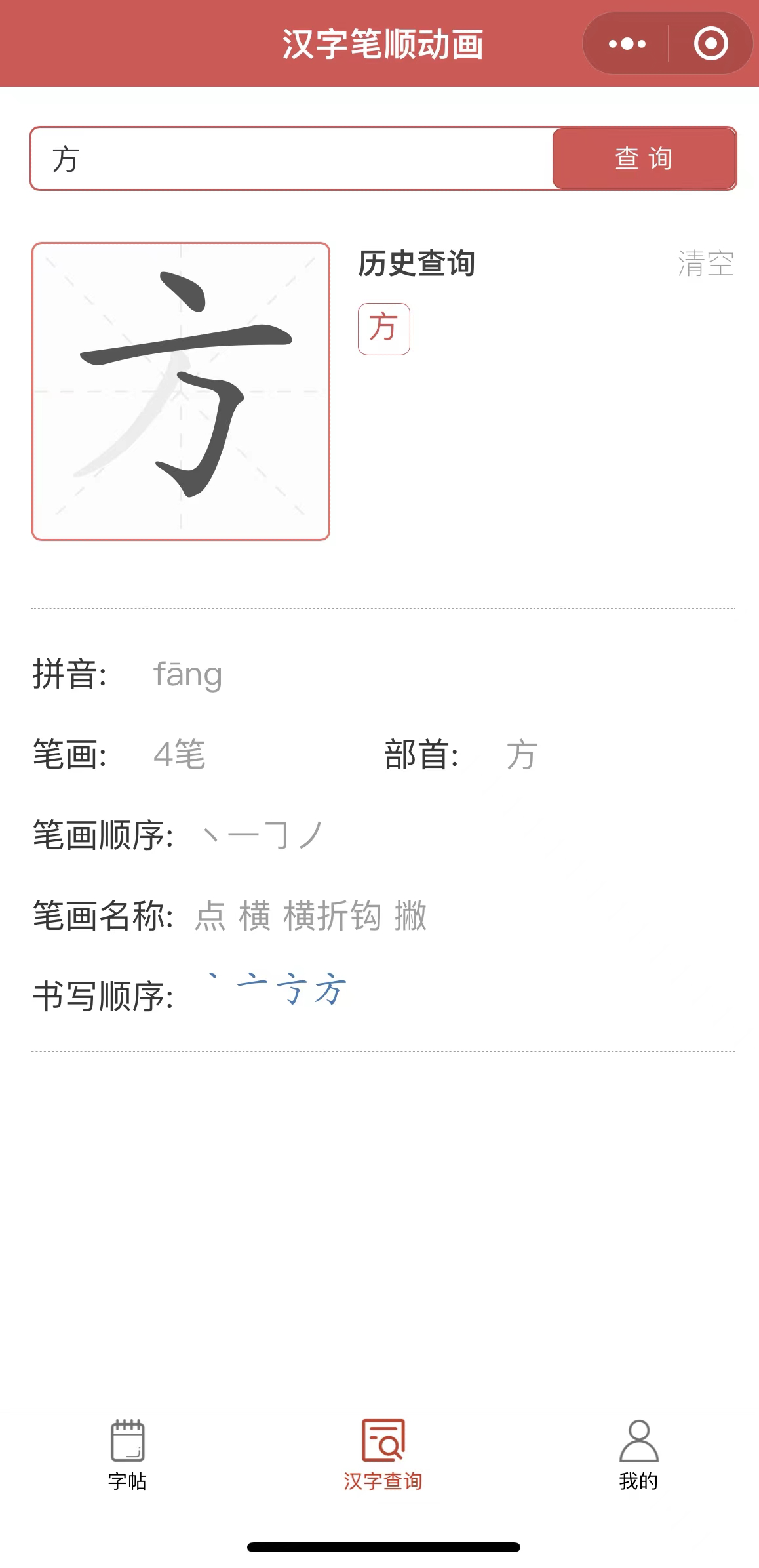 答案:方的第3笔是“横折钩”,而不是“撇”.用了此功能才发现以前很多字的书写顺序是错误的.