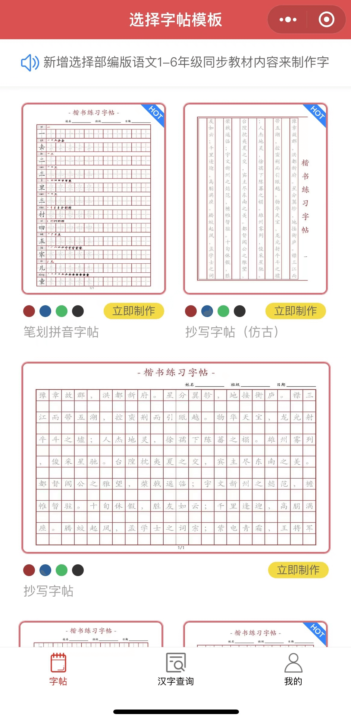 好了,这就是这个小程序主要的功能,一些新的功能正在陆续的添加中,例如:生成笔画偏旁练习字帖,控笔练习字帖,以及其它版本的1-6年级语文教材识字写字内容,更多字体支持等,敬请期待.