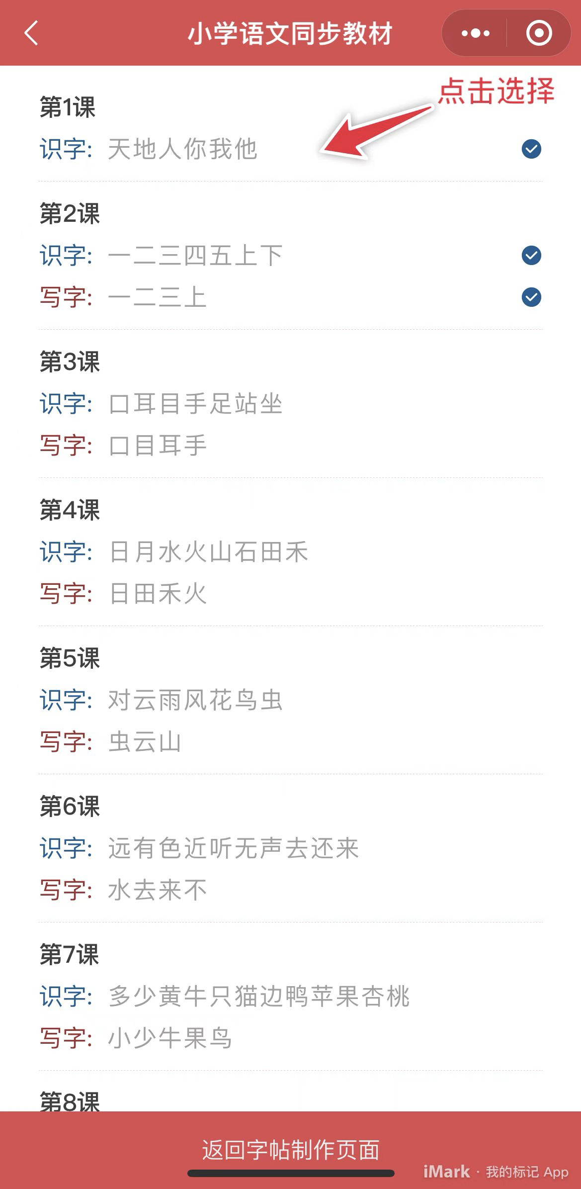 如果想生成小学同步教材认字识字字帖,还可以点击输入内容右侧的蓝色“小学语文同步教材”链接,打开预设的小学同步课本中的识字和写字内容,在想要选择的内容上点击就会选中当前内容